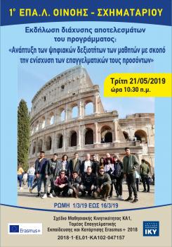 Το 1ο ΕΠΑ.Λ. Οινόης Σχηματαρίου ολοκλήρωσε με επιτυχία το ταξίδι στη Ρώμη από 1/3/19 έως 16/3/19, στα πλαίσια του εγκεκριμένου Ευρωπαϊκού προγράμματος κινητικότητας Erasmus+ KA1 με τίτλο: «Ανάπτυξη των ψηφιακών δεξιοτήτων των μαθητών με σκοπό την ενίσχυση των επαγγελματικών τους προσόντων» και κωδικό 2018-1-EL01-KA102-047157.